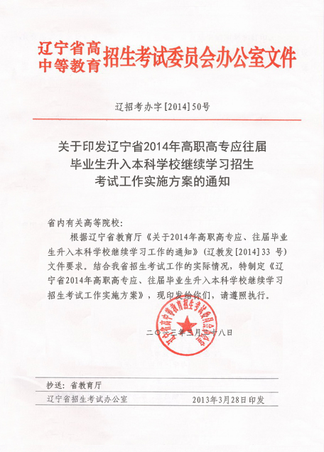 根据辽宁省教育厅《关于2014年高职高专应、往届毕业生升入本科学校继续学习工作的通知》有关规定,结合我省高职高专应、往届毕业生升入本科学校继续学习的招生考试实际情况,为做好今年的招生考试工作,研究制定本实施方案。