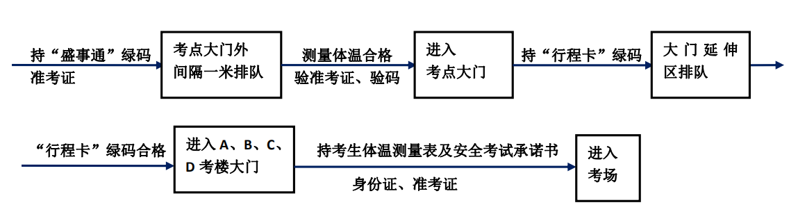 考生经测量体温合格后进入考点,须持有“盛事通健康通行码”、“通信行程卡”绿码,方能进入考场参加考试。考生进入考场前,需要验码。为避免拥堵,开放入场时间为上午6:30—8:30,下午12:30—14:30,请考生尽量提前测温、验码入场,以免影响正常考试,上午入场截止时间为8:30,下午入场截止时间为14:30,在截止时间没有入场的考生,后果自负。