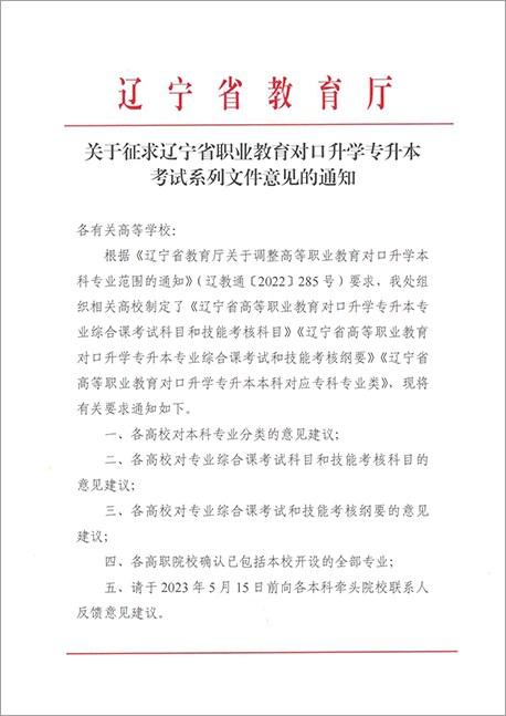 根据《辽宁省教育厅关于调整高等职业教育对口升学本科专业范围的通知》(辽教通〔2022〕285号)要求,我处组织相关高校制定了《辽宁省高等职业教育对口升学专升本专业综合课考试科目和技能考核科目》《辽宁省高等职业教育对口升学专升本专业综合课考试和技能考核纲要》《辽宁省高等职业教育对口升学专升本本科对应专科专业类》,现将有关要求通知如下。
